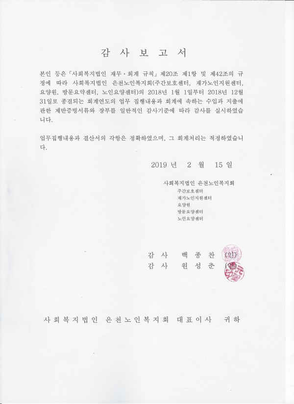 2018년 법인회계감사 보고서 페이지 정보 작성자 은천노인복지회 작성일19-02-27 14:31 조회139,201회 댓글0건 관련링크 이전글 다음글 목록 답변 본문 2018년 법인회계감사 보고서입니다. 이전글 다음글 목록 답변