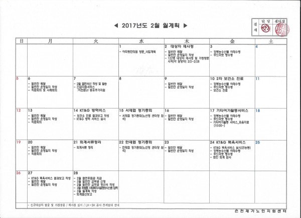 2017년 2월 월계획 페이지 정보 작성자 은천노인복지회 작성일17-02-01 17:47 조회77,795회 댓글0건 관련링크 이전글 다음글 목록 답변 본문 은천재가노인지원센터 2017년 2월 월계획 이전글 다음글 목록 답변