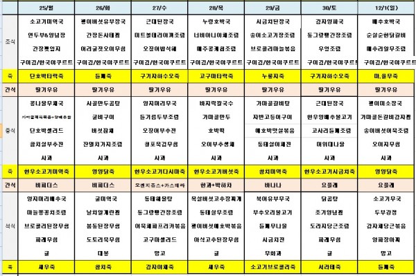 11월넷째주식단표 페이지 정보 작성자 은천노인복지회 작성일19-11-27 09:21 조회38,558회 댓글0건 관련링크 이전글 다음글 목록 답변 본문 ※ 모든 식사에는 잡곡밥과 김치가 제공됩니다. ※ 식단은 식재료수급에 의해 변경될 수 있습니다. 이전글 다음글 목록 답변