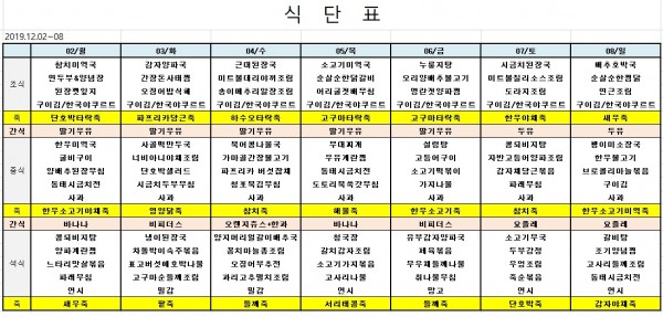 12월첫째주식단표 페이지 정보 작성자 은천노인복지회 작성일19-12-02 18:02 조회38,434회 댓글0건 관련링크 이전글 다음글 목록 답변 본문 ※ 모든 식사에는 잡곡밥과 김치가 제공됩니다. ※ 식단은 식재료수급에 의해 변경될 수 있습니다. 이전글 다음글 목록 답변