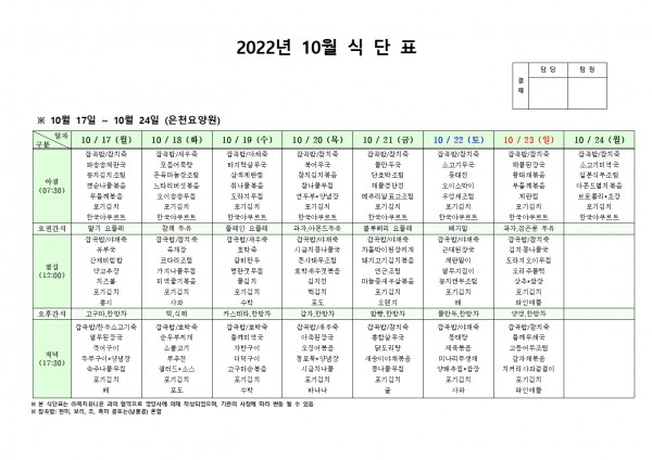 10월 셋째주 식단표 페이지 정보 작성자 은천노인복지회 작성일22-10-13 17:30 조회91,346회 댓글0건 관련링크 이전글 다음글 목록 답변 본문 . 이전글 다음글 목록 답변