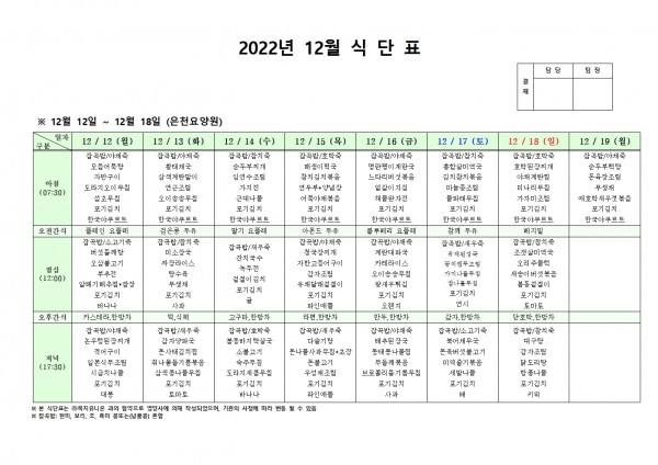 12월 둘째주 식단표 페이지 정보 작성자 은천노인복지회 작성일22-12-08 14:20 조회85,769회 댓글0건 관련링크 이전글 다음글 목록 답변 본문 . 이전글 다음글 목록 답변