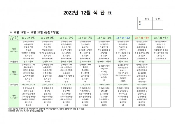 12월 셋째주 식단표 페이지 정보 작성자 은천노인복지회 작성일22-12-16 15:00 조회85,301회 댓글0건 관련링크 이전글 다음글 목록 답변 본문 . 이전글 다음글 목록 답변