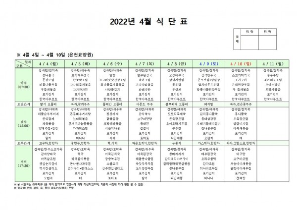 4월 첫째주 식단표 페이지 정보 작성자 은천노인복지회 작성일22-04-01 11:35 조회108,578회 댓글0건 관련링크 이전글 다음글 목록 답변 본문 . 이전글 다음글 목록 답변
