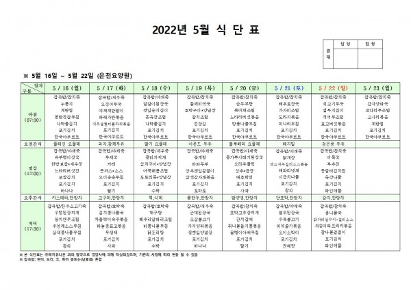 5월 셋째주 식단표 페이지 정보 작성자 은천노인복지회 작성일22-05-12 10:54 조회102,673회 댓글0건 관련링크 이전글 다음글 목록 답변 본문 . 이전글 다음글 목록 답변
