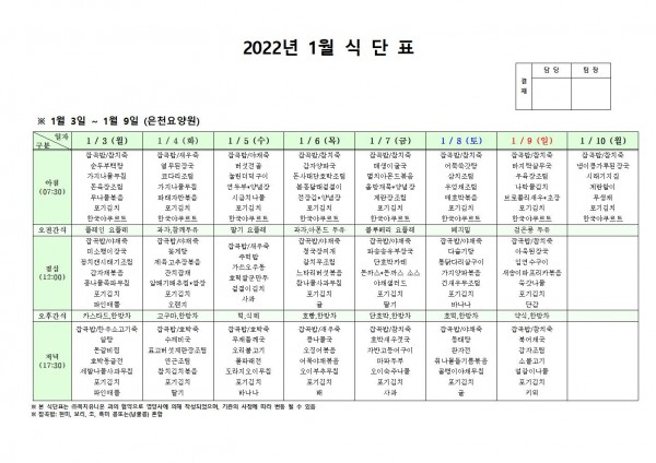2022년 1월 첫째주 식단표 페이지 정보 작성자 은천노인복지회 작성일21-12-30 17:37 조회118,518회 댓글0건 관련링크 이전글 다음글 목록 답변 본문 . 이전글 다음글 목록 답변