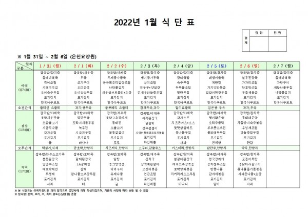 2월 첫째주 식단표 페이지 정보 작성자 은천노인복지회 작성일22-01-29 11:54 조회115,511회 댓글0건 관련링크 이전글 다음글 목록 답변 본문 . 이전글 다음글 목록 답변