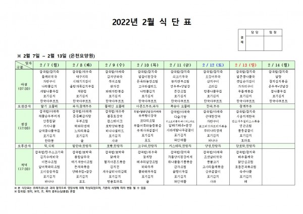 2월 둘째주 식단표 페이지 정보 작성자 은천노인복지회 작성일22-02-04 18:58 조회116,153회 댓글0건 관련링크 이전글 다음글 목록 답변 본문 . 이전글 다음글 목록 답변