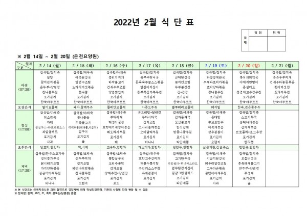 2월 셋째주 식단표 페이지 정보 작성자 은천노인복지회 작성일22-02-10 16:28 조회116,052회 댓글0건 관련링크 이전글 다음글 목록 답변 본문 . 이전글 다음글 목록 답변