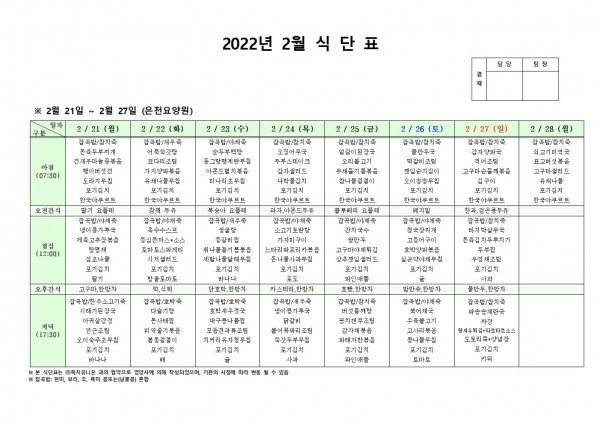 2월 넷째주 식단표 페이지 정보 작성자 은천노인복지회 작성일22-02-25 09:21 조회114,459회 댓글0건 관련링크 이전글 다음글 목록 답변 본문 . 이전글 다음글 목록 답변