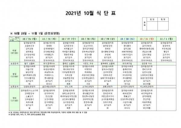 10월 넷째주 식단표 페이지 정보 작성자 은천노인복지회 작성일21-10-26 08:56 조회122,905회 댓글0건 관련링크 이전글 다음글 목록 답변 본문 . 이전글 다음글 목록 답변
