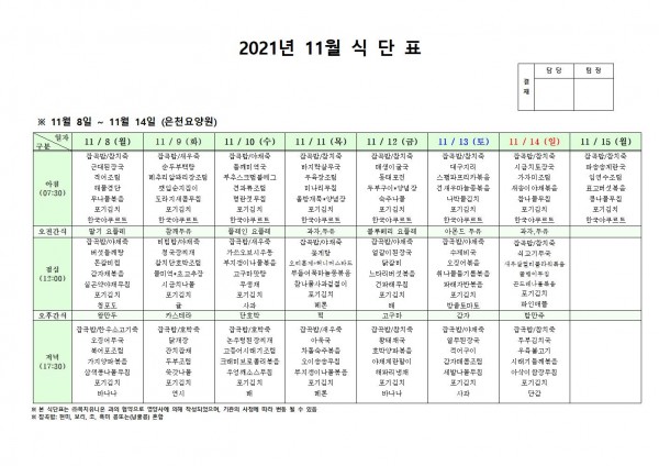 11월 둘째주 식단표 페이지 정보 작성자 은천노인복지회 작성일21-11-04 16:57 조회122,964회 댓글0건 관련링크 이전글 다음글 목록 답변 본문 . 이전글 다음글 목록 답변