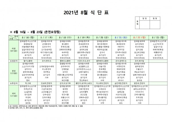 8월 셋째주 식단표 페이지 정보 작성자 은천노인복지회 작성일21-08-12 17:43 조회127,452회 댓글0건 관련링크 이전글 다음글 목록 답변 본문 . 이전글 다음글 목록 답변