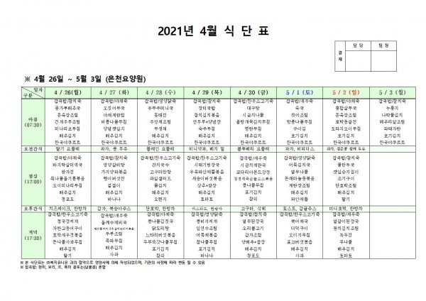 4월 넷째주 식단표 페이지 정보 작성자 은천노인복지회 작성일21-04-22 18:32 조회135,005회 댓글0건 관련링크 이전글 다음글 목록 답변 본문 식단표 이전글 다음글 목록 답변