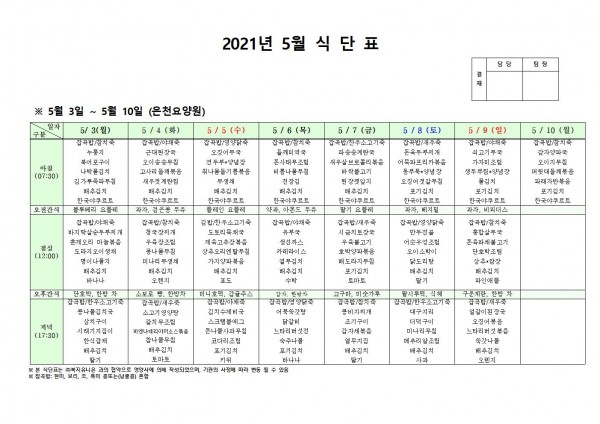 5월 첫째주 식단표 페이지 정보 작성자 은천노인복지회 작성일21-05-03 13:44 조회134,953회 댓글0건 관련링크 이전글 다음글 목록 답변 본문 5월 식단표 이전글 다음글 목록 답변