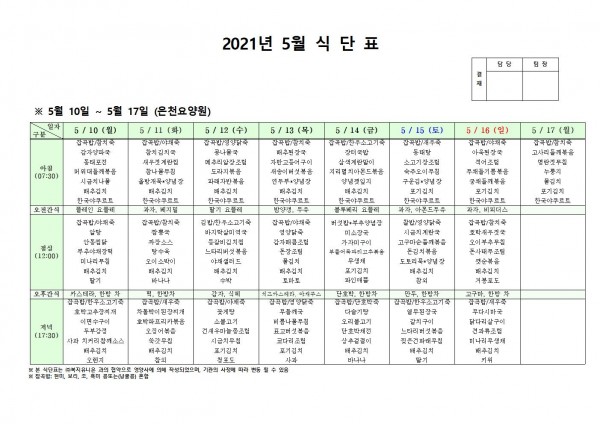 5월 둘째주 식단표 페이지 정보 작성자 은천노인복지회 작성일21-05-06 22:23 조회134,235회 댓글0건 관련링크 이전글 다음글 목록 답변 본문 5월 둘째주 식단표 이전글 다음글 목록 답변