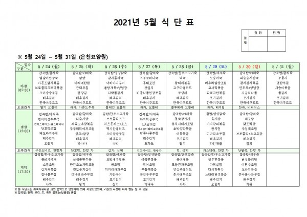5월 넷째 주 식단표 페이지 정보 작성자 은천노인복지회 작성일21-05-21 16:38 조회132,516회 댓글0건 관련링크 이전글 다음글 목록 답변 본문 5월 넷째 주 식단표 이전글 다음글 목록 답변