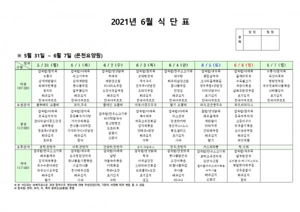6월 첫째주 식단표 페이지 정보 작성자 은천노인복지회 작성일21-05-28 09:47 조회131,478회 댓글0건 관련링크 이전글 다음글 목록 답변 본문 . 이전글 다음글 목록 답변