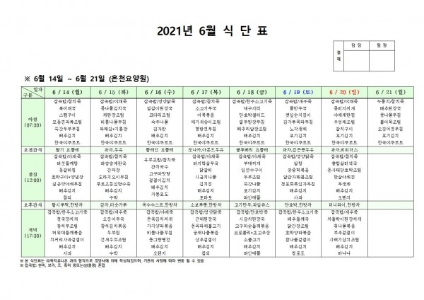 6월 셋째주 식단표 페이지 정보 작성자 은천노인복지회 작성일21-06-11 10:28 조회130,827회 댓글0건 관련링크 이전글 다음글 목록 답변 본문 . 이전글 다음글 목록 답변