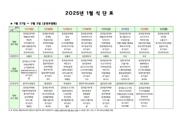 1월 다섯째주 식단표 페이지 정보 작성자 은천노인복지회 작성일25-01-24 10:07 조회13,220회 댓글0건 관련링크 이전글 다음글 목록 답변 본문 . 이전글 다음글 목록 답변
