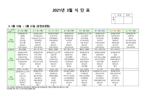 3월 셋째주 식단표 페이지 정보 작성자 은천노인복지회 작성일21-03-12 11:41 조회140,540회 댓글0건 관련링크 이전글 다음글 목록 답변 본문 3월 셋째주 식단표[이 게시물은 은천노인복지회님에 의해 2021-03-12 17:18:24 공지사항에서 이동 됨] 이전글 다음글 목록 답변