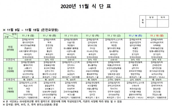11월 둘째주 식단표 페이지 정보 작성자 은천노인복지회 작성일20-12-08 18:09 조회151,857회 댓글0건 관련링크 이전글 다음글 목록 답변 본문 11월 둘째주 식단표 이전글 다음글 목록 답변