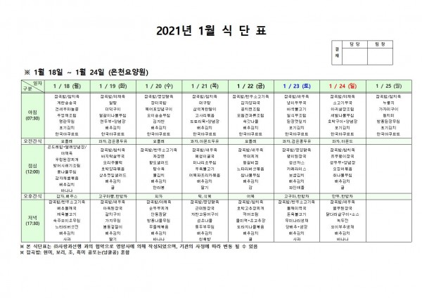 1월 셋째주 식단표 페이지 정보 작성자 은천노인복지회 작성일21-01-15 10:02 조회144,999회 댓글0건 관련링크 이전글 다음글 목록 답변 본문 . 이전글 다음글 목록 답변