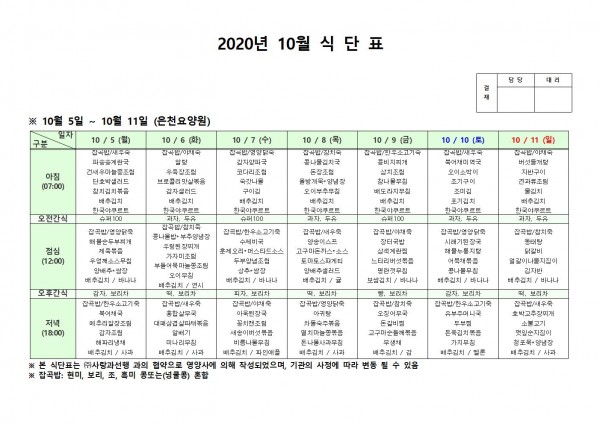 10월 둘째주 식단표 페이지 정보 작성자 은천노인복지회 작성일20-10-12 14:45 조회157,187회 댓글0건 관련링크 이전글 다음글 목록 답변 본문 . 이전글 다음글 목록 답변
