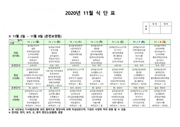 11월 첫째주 식단표 페이지 정보 작성자 은천노인복지회 작성일20-11-13 13:47 조회153,436회 댓글0건 관련링크 이전글 다음글 목록 답변 본문 . 이전글 다음글 목록 답변