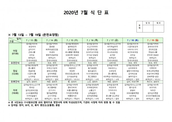 7월 셋째주 식단표 페이지 정보 작성자 은천노인복지회 작성일20-07-20 16:13 조회164,792회 댓글0건 관련링크 이전글 다음글 목록 답변 본문 . 이전글 다음글 목록 답변