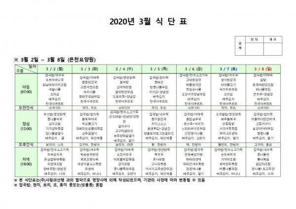 3월 첫째주 식단표 페이지 정보 작성자 은천노인복지회 작성일20-03-09 11:55 조회176,636회 댓글0건 관련링크 이전글 다음글 목록 답변 본문 . 이전글 다음글 목록 답변