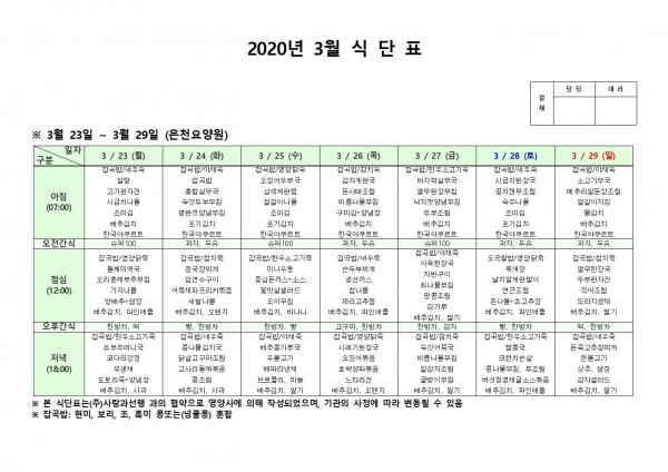 3월 넷째주 식단표 페이지 정보 작성자 은천노인복지회 작성일20-03-31 16:09 조회176,591회 댓글0건 관련링크 이전글 다음글 목록 답변 본문 . 이전글 다음글 목록 답변