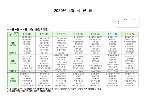 4월 첫째주 식단표 페이지 정보 작성자 은천노인복지회 작성일20-04-13 15:04 조회175,186회 댓글0건 관련링크 이전글 다음글 목록 답변 본문 . 이전글 다음글 목록 답변