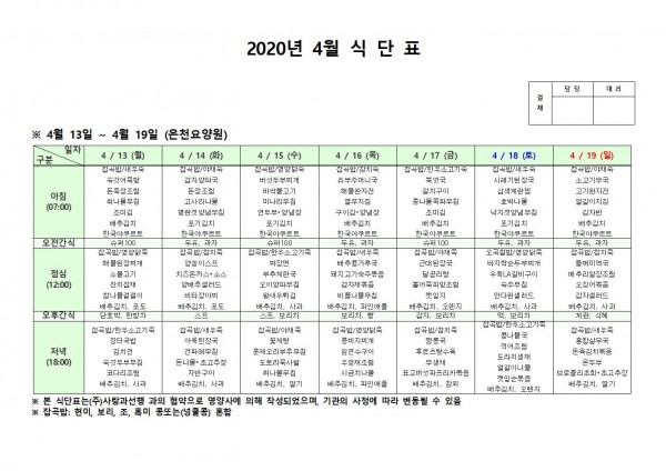 4월 둘째주 식단표 페이지 정보 작성자 은천노인복지회 작성일20-04-20 16:27 조회174,592회 댓글0건 관련링크 이전글 다음글 목록 답변 본문 . 이전글 다음글 목록 답변