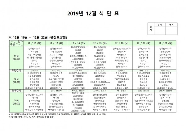 12월 셋째주 식단표 페이지 정보 작성자 은천노인복지회 작성일19-12-23 14:06 조회184,979회 댓글0건 관련링크 이전글 다음글 목록 답변 본문 12월 셋째주 식단표입니다. 이전글 다음글 목록 답변