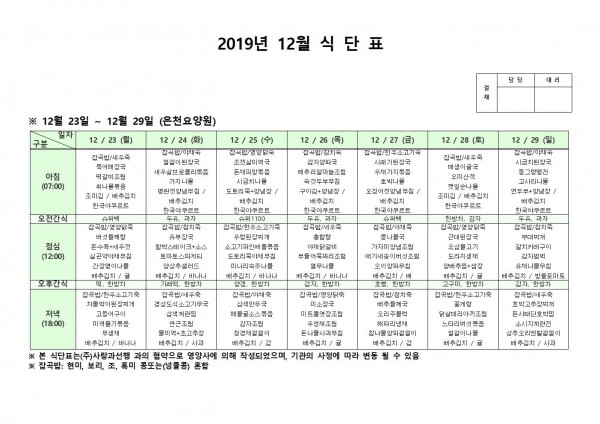 12월 넷째주 식단표 페이지 정보 작성자 은천노인복지회 작성일19-12-30 14:32 조회185,132회 댓글0건 관련링크 이전글 다음글 목록 답변 본문 12월 넷째주 식단표입니다 이전글 다음글 목록 답변