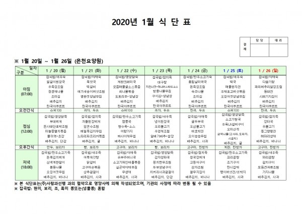 1월 셋째주 식단표 페이지 정보 작성자 은천노인복지회 작성일20-01-28 14:25 조회182,012회 댓글0건 관련링크 이전글 다음글 목록 답변 본문 1월 셋째주 식단표입니다. 이전글 다음글 목록 답변