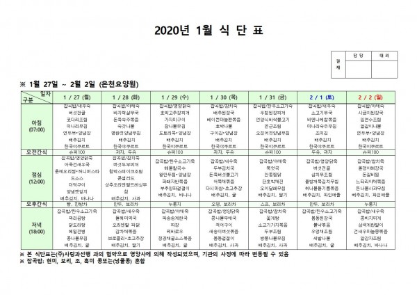 1월 넷째주 식단표 페이지 정보 작성자 은천노인복지회 작성일20-02-04 09:37 조회180,694회 댓글0건 관련링크 이전글 다음글 목록 답변 본문 1월 넷째주 식단표입니다. 이전글 다음글 목록 답변