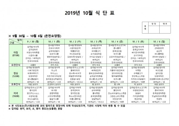 10월 첫째주 식단표 페이지 정보 작성자 은천노인복지회 작성일19-10-07 15:21 조회190,968회 댓글0건 관련링크 이전글 다음글 목록 답변 본문 10월 첫째주 식단표 이전글 다음글 목록 답변