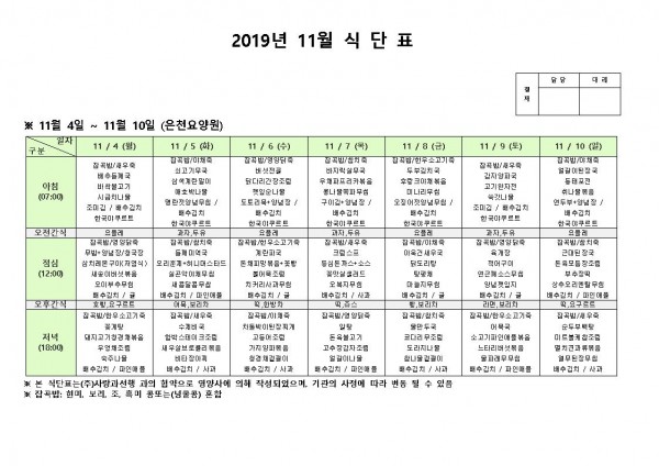 11월 첫째주 식단표 페이지 정보 작성자 은천노인복지회 작성일19-11-12 14:17 조회189,293회 댓글0건 관련링크 이전글 다음글 목록 답변 본문 11월 첫째주 식단표 이전글 다음글 목록 답변