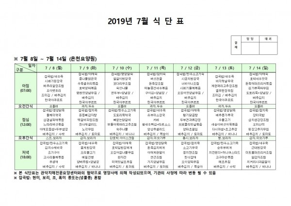 7월 둘째주 식단표 페이지 정보 작성자 은천노인복지회 작성일19-07-15 10:56 조회195,225회 댓글0건 관련링크 이전글 다음글 목록 답변 본문 7월 둘째주 식단표 이전글 다음글 목록 답변