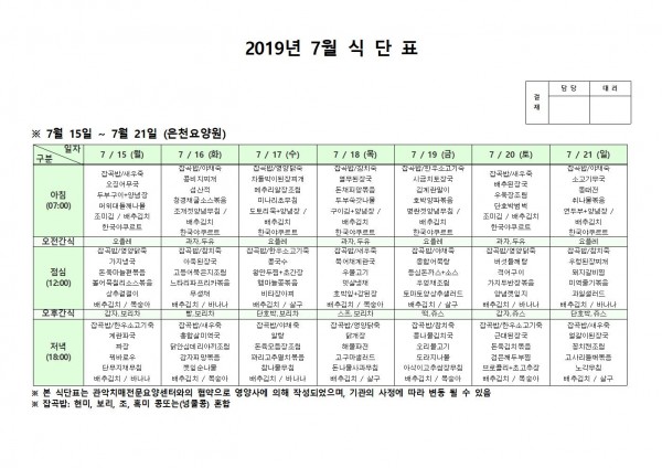 7월 셋째주 식단표 페이지 정보 작성자 은천노인복지회 작성일19-07-22 11:09 조회195,612회 댓글0건 관련링크 이전글 다음글 목록 답변 본문 7월 셋째주 식단표 이전글 다음글 목록 답변