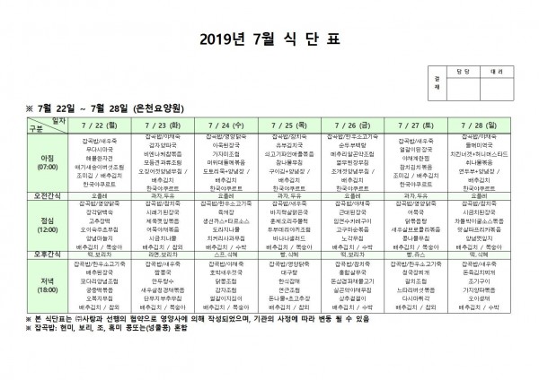 7월 넷째주 식단표 페이지 정보 작성자 은천노인복지회 작성일19-07-29 13:58 조회194,767회 댓글0건 관련링크 이전글 다음글 목록 답변 본문 7월 넷째주 식단표 이전글 다음글 목록 답변