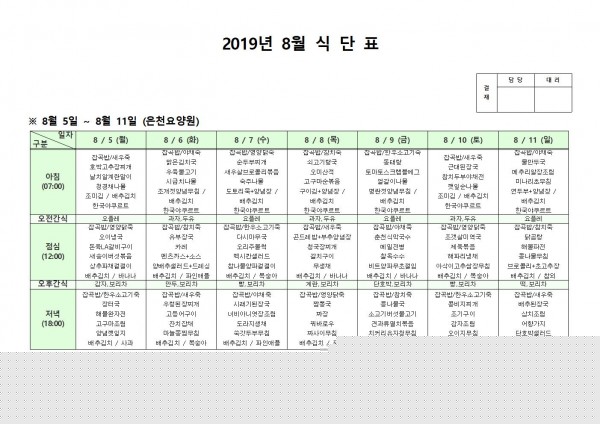 8월 둘째주 식단표 페이지 정보 작성자 은천노인복지회 작성일19-08-19 15:26 조회193,944회 댓글0건 관련링크 이전글 다음글 목록 답변 본문 8월 둘째주 식단표 이전글 다음글 목록 답변