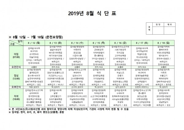 8월 셋째주 식단표 페이지 정보 작성자 은천노인복지회 작성일19-08-19 15:35 조회193,465회 댓글0건 관련링크 이전글 다음글 목록 답변 본문 8월 셋째주 식단표 이전글 다음글 목록 답변