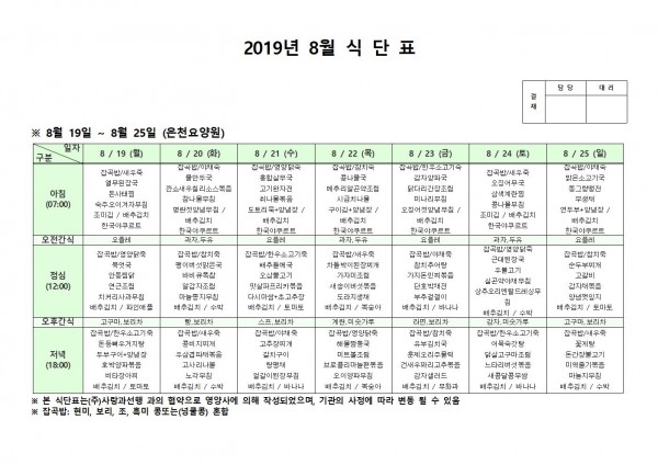 8월 넷째주 식단표 페이지 정보 작성자 은천노인복지회 작성일19-08-26 16:38 조회192,267회 댓글0건 관련링크 이전글 다음글 목록 답변 본문 8월 넷째주 식단표 이전글 다음글 목록 답변