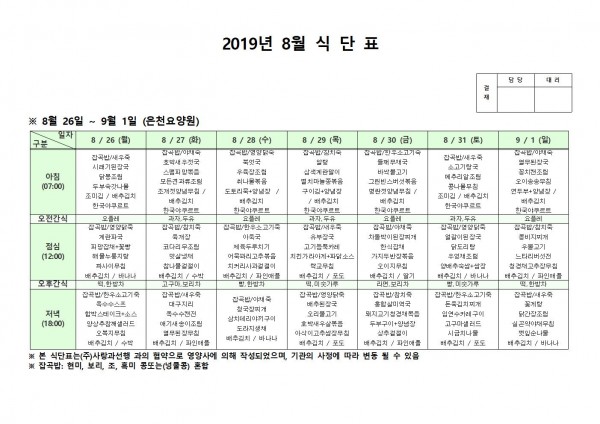 8월 다섯째주 식단표 페이지 정보 작성자 은천노인복지회 작성일19-09-04 17:29 조회193,712회 댓글0건 관련링크 이전글 다음글 목록 답변 본문 8월 다섯째주 식단표 이전글 다음글 목록 답변