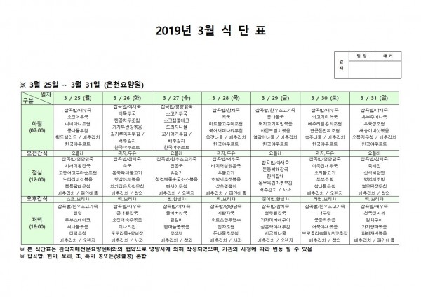 3월 넷째주 식단표 페이지 정보 작성자 은천노인복지회 작성일19-04-01 11:06 조회201,788회 댓글0건 관련링크 이전글 다음글 목록 답변 본문 3월 넷째주 식단표 이전글 다음글 목록 답변
