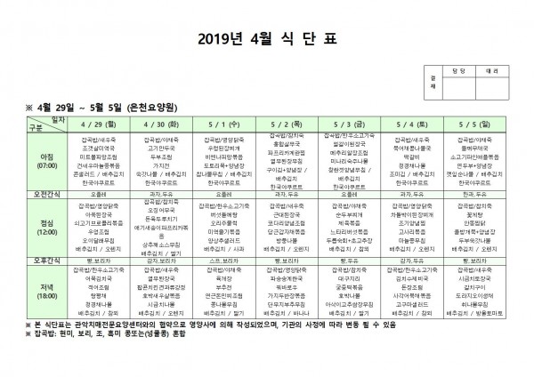 4월 다섯째주 식단표 페이지 정보 작성자 은천노인복지회 작성일19-05-07 14:13 조회201,746회 댓글0건 관련링크 이전글 다음글 목록 답변 본문 4월 다섯째주 식단표 이전글 다음글 목록 답변