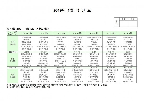 12월 넷째주 식단표 페이지 정보 작성자 은천노인복지회 작성일19-01-22 13:30 조회207,375회 댓글1건 관련링크 이전글 다음글 목록 답변 본문 12월 넷째주 식단표 이전글 다음글 목록 답변